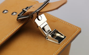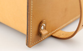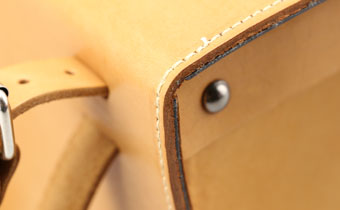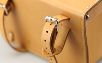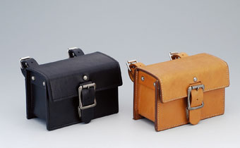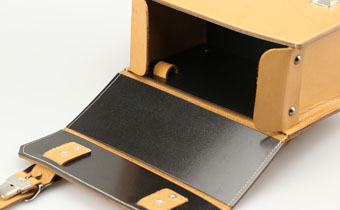 | 本革を使用したツールバッグ。型崩れ防止の樹脂版や開閉が容易にできるバックルを採用し、使い勝手を配慮。