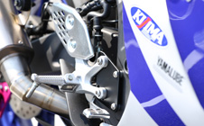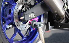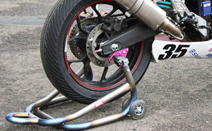 レーシングスタンドを容易に使用できるレーシングスタンドVフック及びスプロケットガード。レーシングスタンドの軸がアクスルシャフトのインライン上となるように設計している為、リアショック等の簡易的な動作確認が行えます。