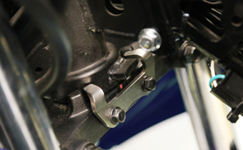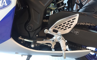 ●純正ステップポジションから、後方へ40~50mm、上方へ35~50mmの範囲で4通りのポジションへ移動可能なステップブラケットです。ステップ移動の際に必要となるマスターシリンダーリザーバータンクの移設用ブラケットも付属しております。