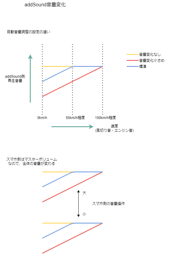 外部音マイクセンサにより風切り音やエンジン音の騒音量を検出して、それに合わせてaddSound内部の音量を変化させます。