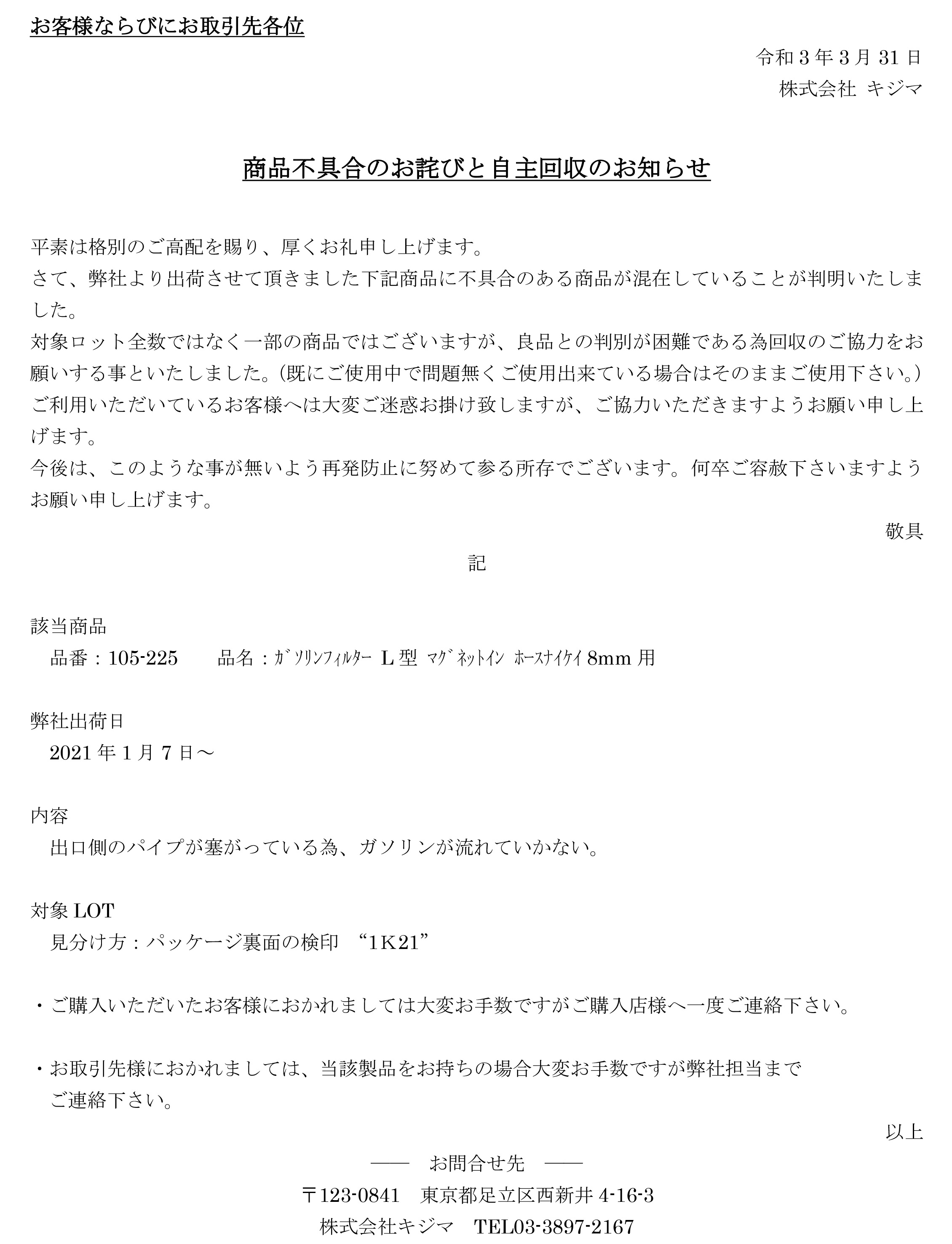 【重要】ガソリンフィルター不具合についてのお詫びと自主回収のお知らせ