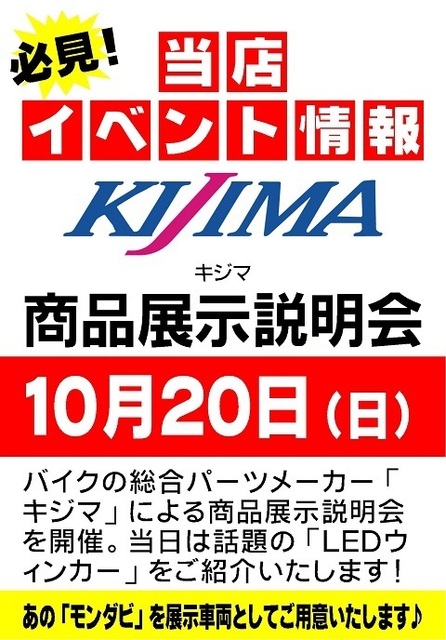 10月20日(日)ナップス足立 店舗イベント 2019.10.10 2019年10月20日(日)にナップス足立店様にてキジマ店舗出展イベントを行います。 キジマオリジナル商品のNANOウインカー・シーケンシャルウインカー展示説明会&話題の”モンダビ”を展示致します。 詳細は>>>コチラ